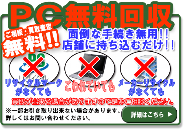 ご不用のパソコンを無料にて回収いたします。リサイクルマークがなくても、壊れていてもお引き取り致します。また、買取が出来る場合がありますので、一度お問い合わせ下さい。